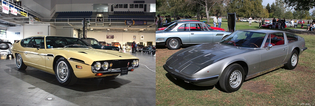 Oggi voglio avventurarmi in un argomento per me insolito: voglio sviluppare un paragone fra due supercars, ossia Lamborghini Espada e Maserati Indy. Tanto per cominciare erano ambedue emiliane (ma non hanno nessuna parentela col celebre omonimo tipo di pasta ‒ a parte il nome, appunto). In secondo luogo, erano due coupé GT pensate e realizzate ciascuna per 4 passeggeri.